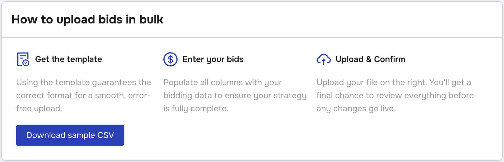 If you don't have a CSV already with the correct format, click Download sample CSV to download our pre-formatted CSV file that you can update with your bid data: